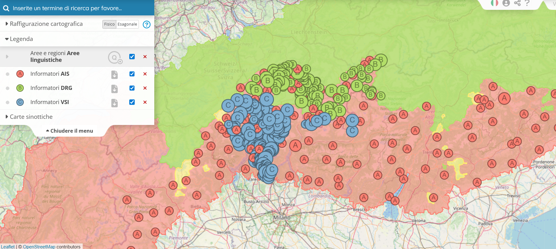 È già stata menzionata la massima aggregazione delle fonti rilevanti dal punto di vista geolinguistico, ovvero quelle fonti il cui materiale è georeferenziato; l'unità di riferimento è il comune politico.6 In Verba Alpina sono stati raccolti diversi tipi di fonti di questo tipo. Ovviamente sono stati adoperati innanzitutto gli atlanti linguistici dell'area alpina già pubblicati; inoltre sono stati utilizzati anche questi dizionari i cui dati sono localizzati con tale precisione da poter essere georeferenziati (cf la panoramica sotto https://www.verba-alpina.gwi.uni-muenchen.de?page_id=133&db=232&tk=5191). Questa condizione è effettivamente soddisfatta dai dizionari esemplari dei dialetti e delle lingue minori romanzi, poiché sono stati creati secondo la logica degli atlanti, in modo che i materiali possano essere georeferenziati e visualizzati cartograficamente nel corso della loro retrodigitalizzazione. La mappa seguente mostra, a titolo esemplificativo, le reti di rilevamento molto dense del DRG e del VSI, che sono state georeferenziate nell'ambito di Verba Alpina, in combinazione con i punti AIS, in modo che i dati di entrambi i dizionari possano essere visualizzati insieme ai dati dell'atlante: