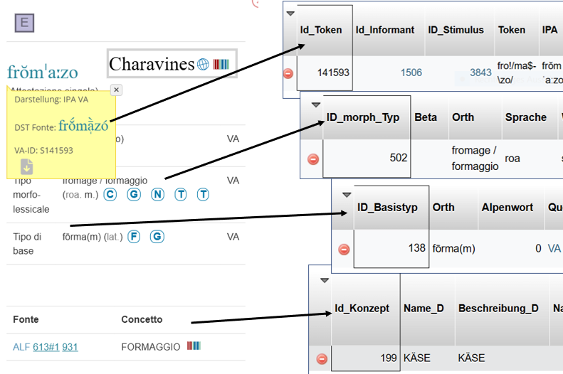 È necessario distinguere categoricamente tra dati di input e dati di output. Il vasto materiale di input, non raccolto autonomamente ma acquisito, è stato in gran parte convertito in dati digitali da Verba Alpina; nell'output, ovvero nell'interfaccia utente di Verba Alpina, esso è conforme ai principi FAIR. Per questa elaborazione, effettuata in gran parte “a mano”, sono stati sviluppati strumenti speciali. Nell'aggregazione è importante sviluppare regole per la gestione dei sistemi di trascrizione delle fonti, spesso diversi tra loro. Si raccomanda una doppia strategia: da un lato, mantenere la trascrizione originale per garantire la fedeltà alla fonte e, dall'altro, offrire una trascrizione uniforme per facilitarne l'utilizzo. (vgl. Krefeld 2023o). Una singola attestazione (in questo caso dall'ALF) si presenta nel modo seguente (la finestra si apre cliccando sull'icona della mappa):
